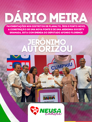 Em Dário Meira, o pacote contempla pavimentação nos distritos de Planalto, Íris e Ponto Novo, construção de nova ponte e construção de areninha society gramada, esta última com emenda do deputado Afonso Florence, em ato acompanhado pela prefeita Mari Dias.